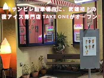 サンビレ駐車場内に、武雄初!の夜アイス専門店 TAKE ONEがオープン‼カラオケご利用の方は店内で注文、お部屋で食べられます!お盆期間中は13:00〜販売します。